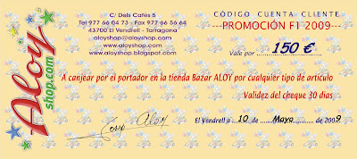 Posteriormente y entre el resto de participasntes, incluidos los que hayan acertado Pole y Piloto ganador y no hayan sido agraciados con el cheque de 150€, sortearemos otro cheque-regalo de 50€ tambien canjeable en ALOY por cualquier tipo de articulo no necesariamente de slot.